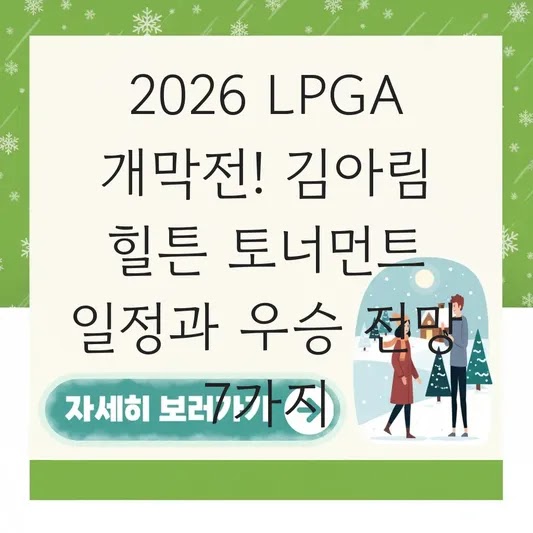Q1. 김아림 힐튼 그랜드 배케이션스 토너먼트 프리뷰 일정은 언제인가요? A: 2026년 LPGA 투어 개막전인 이 대회의 공식 일정은 2026년 1월 29일(목)부터 2월 2일(월)까지 4일간 진행됩니다. 한국 시간으로는 1월 30일(금)부터 새벽 시간에 생중계가 시작됩니다.